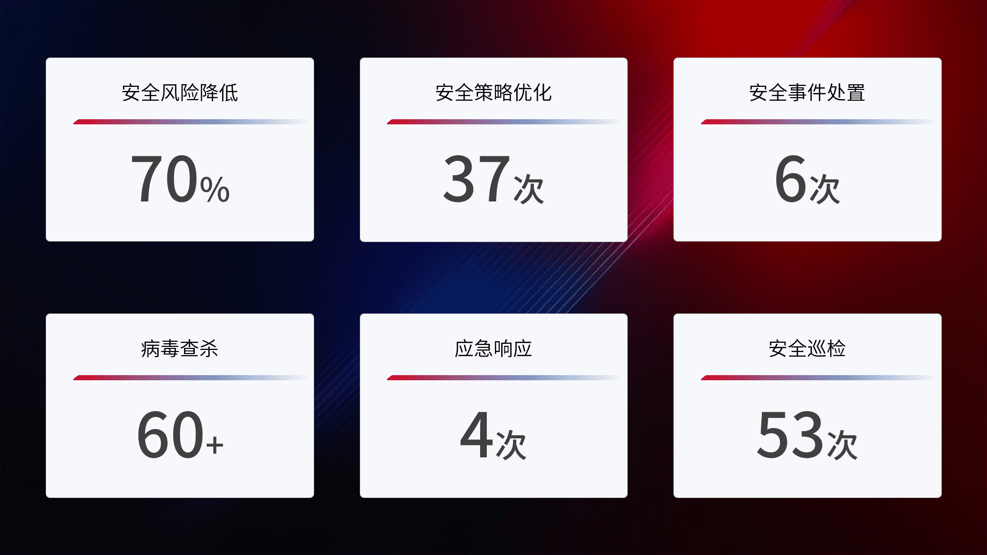 提供全面的安全事件报告体系,,,,包括处置报告、、、、周报、、、、季度和年度总结,,结合持续监控,,,帮助客户深入了解网络安全状况。。。