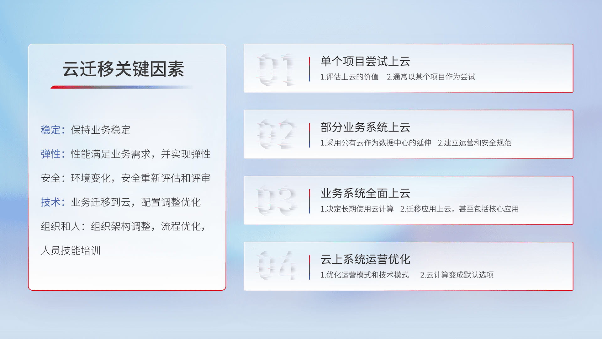 结合实际业务,,,从规划设计、、、、云平台选型、、、云原生改造、、、数据迁移、、、、集成交付,,,迁移全过程为客户识别最佳上云路径,,,做好风险识别管理,,设计网络架构、、、身份权限、、安全审计合规、、、、操作审计、、、日志审计、、、监控告警策略、、、、多站点容灾设计等,,对云上基础设施进行整体规划,,提升IT治理水平,,以满足弹性、、、高可用、、高性能的需求。。