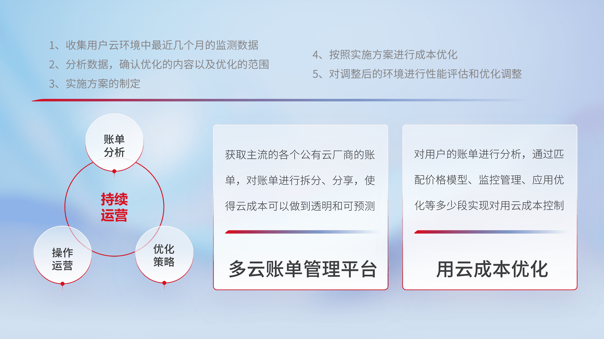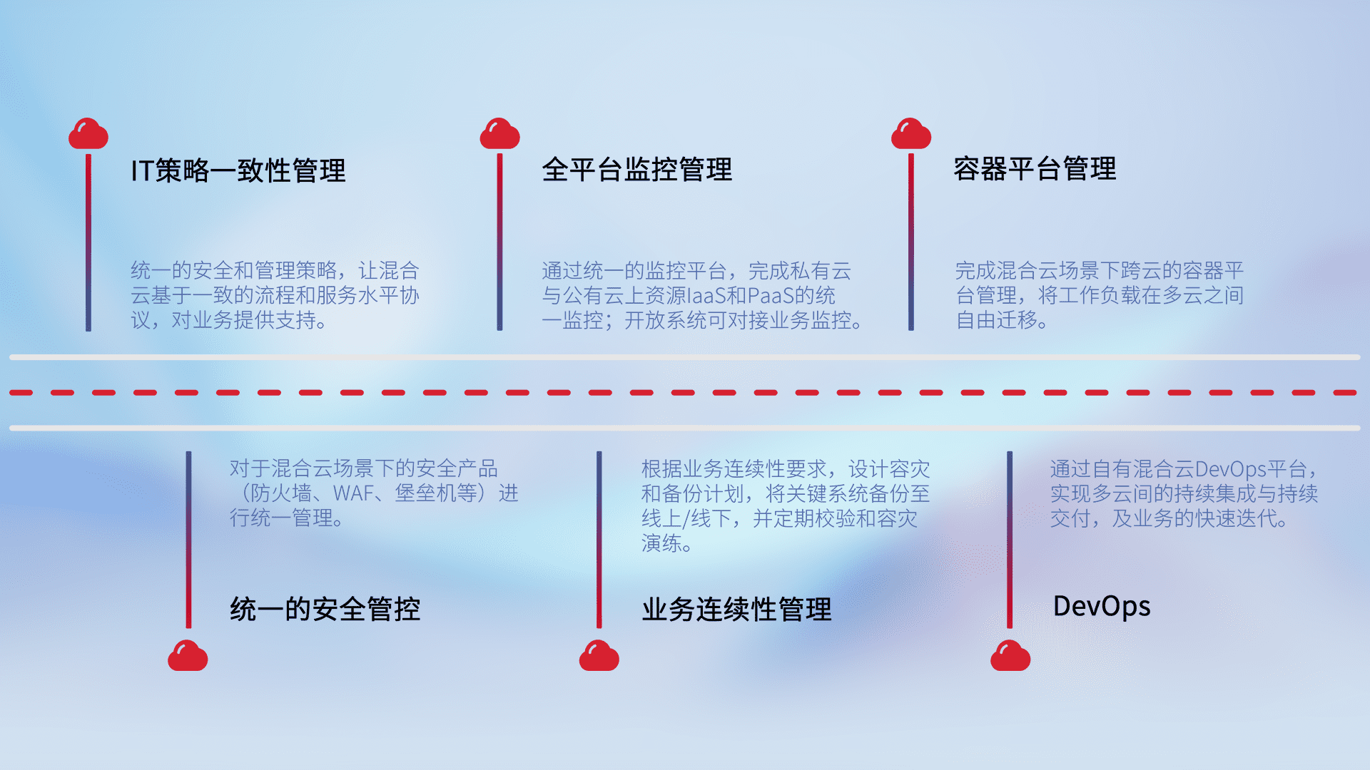 通过多云纳管,,,,以统一的资源数据模型把客户的云资源进行抽象和封装,,进而实现对多云资源的统一操作,,,,保障云资源管理的可靠性、、、、稳定性与可用性。。。。量身定制化运维内容,,,配置、、开发运维、、补丁管理、、、备份、、监控、、、、认证和访问管理、、审计和日常巡检等,,,,保障在用云过程中的可靠度,,稳定度以及高可用率。。。