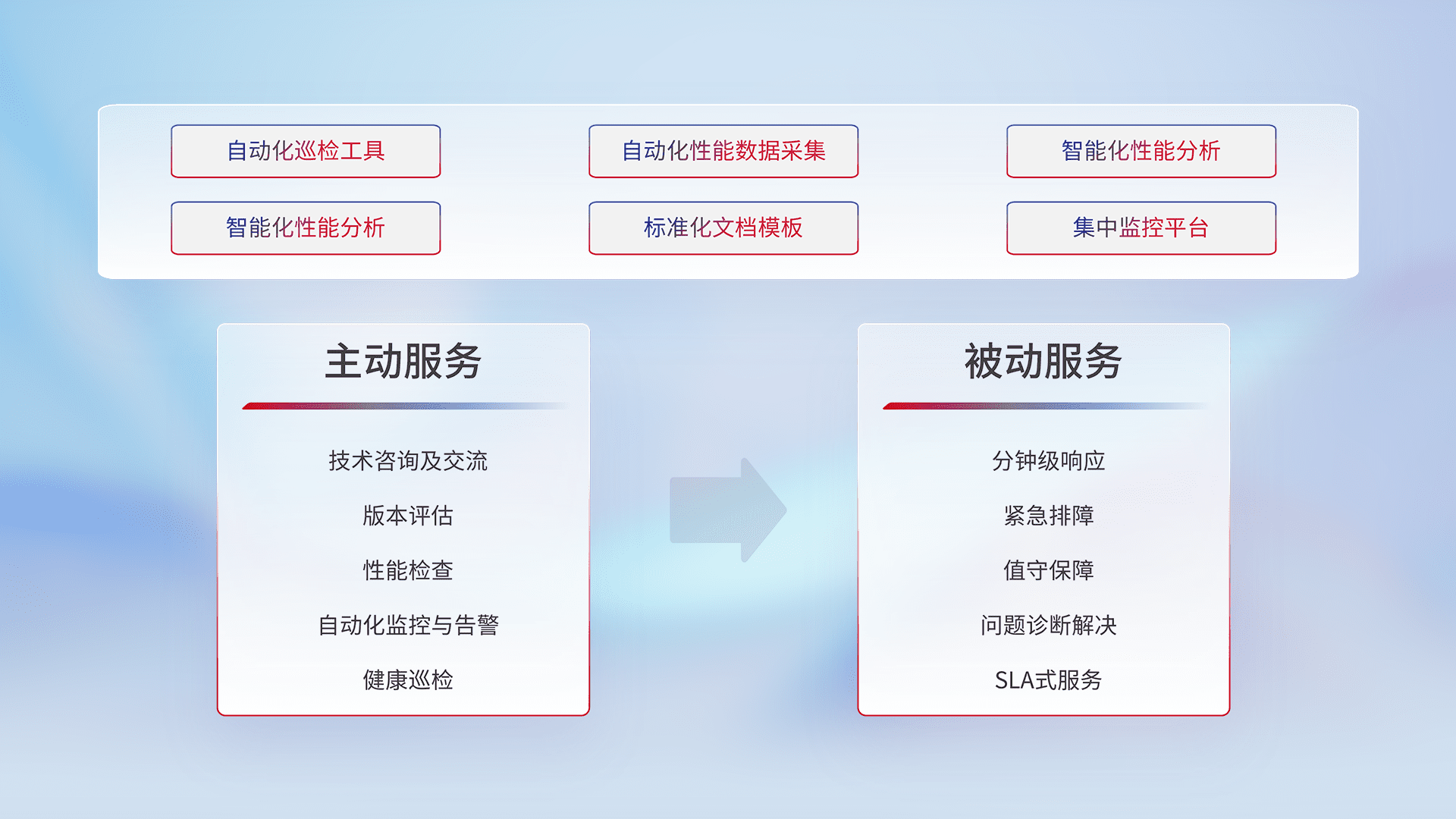 智能化工具和标准化文档,,,保障服务质量,,,,提供主动服务(包含技术咨询、、、版本评估、、、、性能检查、、、自动化监控与告警、、、、健康巡检)和被动服务包含(分钟级响应、、紧急排障、、、、值守保障、、、问题诊断解决、、、、SLA服务)。。。